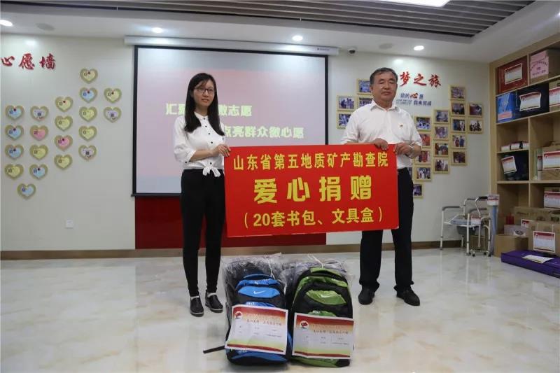 6月6日,山东省第五地质矿产勘查院的党员们带来了前期认领的20个微心愿——爱心书包和文具,他们现场观看了“泰山先锋”志愿行动宣传片后,又纷纷拿出手机扫描基金二维码,为泰山先锋慈善基金捐款,用奉献爱心的实际行动彰显了共产党员的为民情怀。