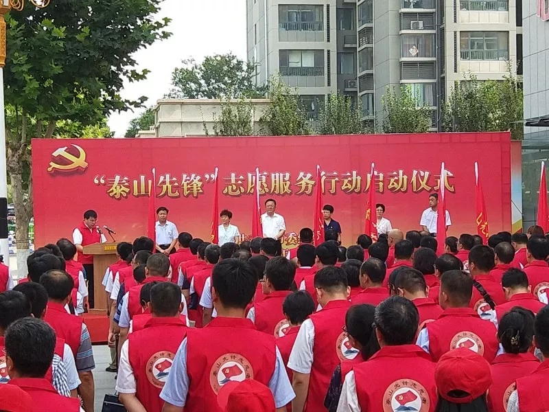 7月19日,“泰山先锋”志愿服务行动启动仪式在市主题党日活动中心举行。当天,300余名党员志愿者走进创城一线和街道社区,开展各种形式的志愿服务活动,拉开了全市“泰山先锋”志愿服务行动的序幕。启动仪式现场,市主题党日活动中心“泰山先锋”志愿服务总站揭牌,各县市区、泰安高新区、泰山景区、泰安旅游经济开发区组织部门分管负责同志,市直各部门单位分管负责同志及“泰山先锋”志愿者代表等300余人参加启动仪式。